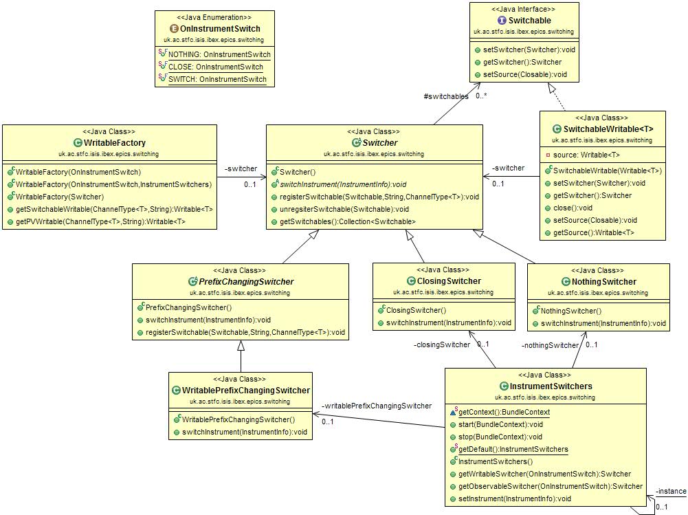 The design of switchable PVs in the GUI uses a factory to create PV Observables, which are passed the switching behaviour as a switcher class. Each of these switcher classes provides a different switching functionality and is switched using the Eclipse extension point that is globally used for instrument switching in the GUI.